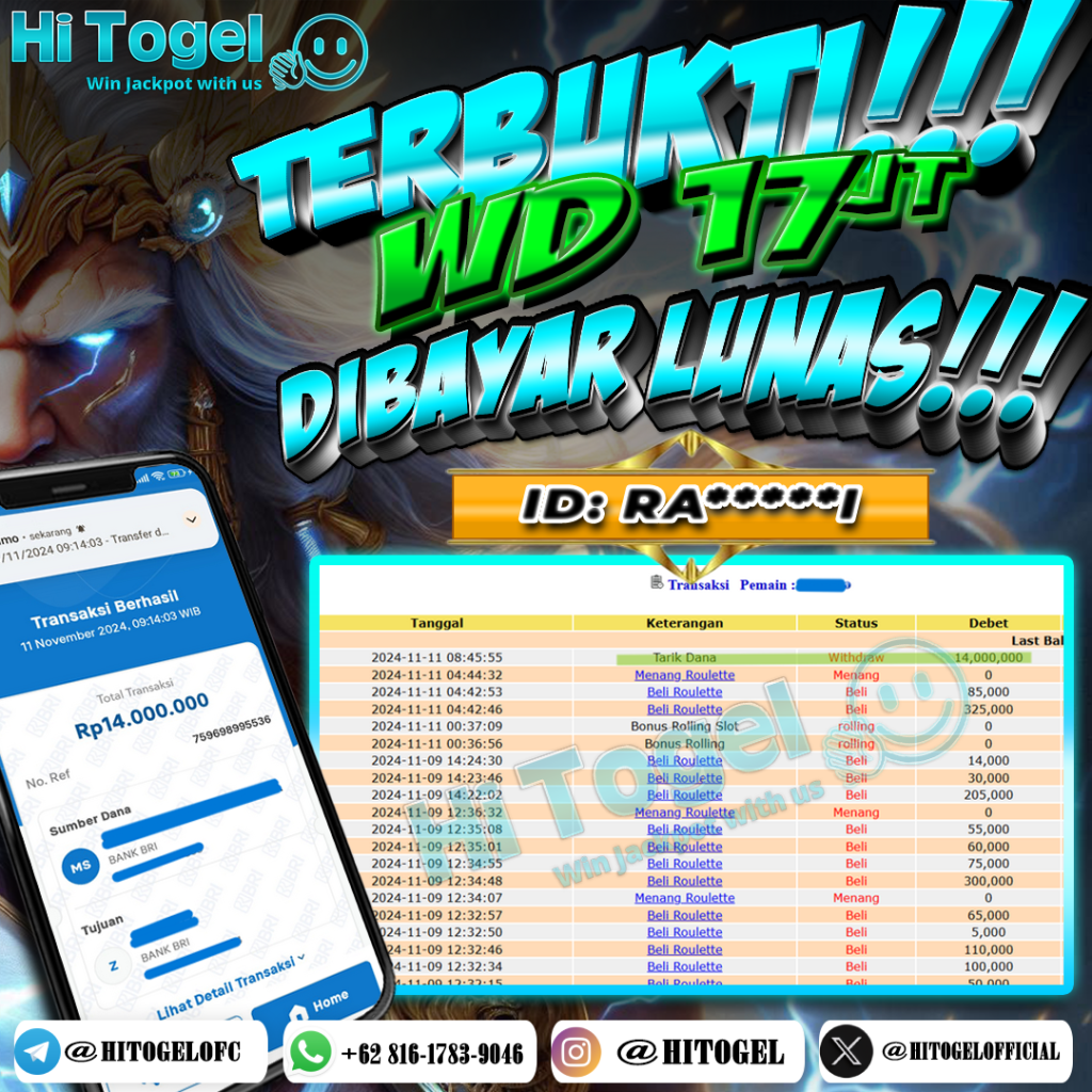 Bukti JP & WD Pemain HiTogel #246 hitogelofficial November 11, 2024 Bukti WD Bukti JP & WD Pemain HiTogel #246 Selamat atas kemenangannya!!User ID : ra****iPermainan: Roulette (Live Games)Total Withdraw: Rp 17,000.000,-LUNAS!!!